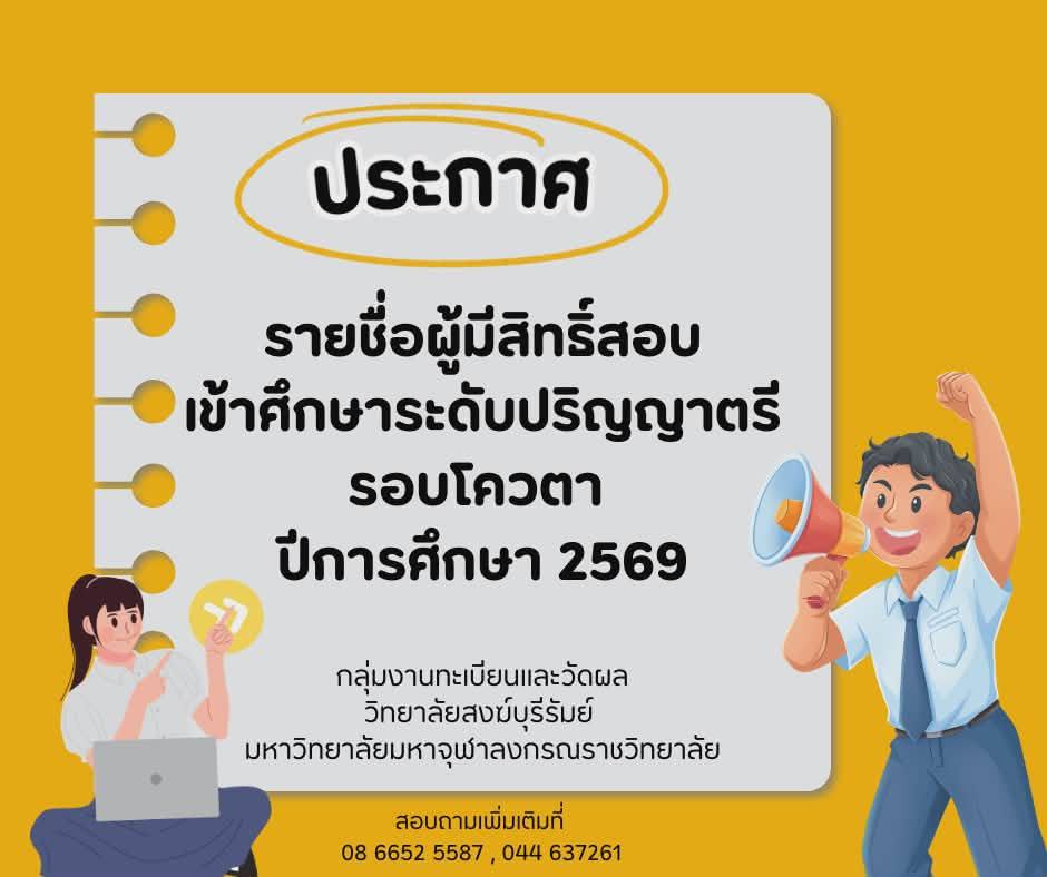 by: webadminMarch 2, 2026Leave a Comment on ประกาศรายชื่อผู้มีสิทธิ์สอบเข้าศึกษาต่อระดับปริญญาตรีรอบโควตาปีการศึกษา 2569